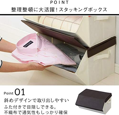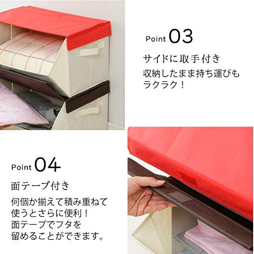 ふたを開けて重ねると、出し入れラクラク。折りたためるスタッキングボックスです。<br>使用しない時は、折りたたんで隙間に収納できます。<br>重ねたままでもふたを面テープで留められるので下のボックスに収納した物も取りだすことができます。<br>収納したままでも持ち運びができる様に取っ手が付いています。<br>落ち着いたブラウンと明るいレッドで家中どこでも使えます。