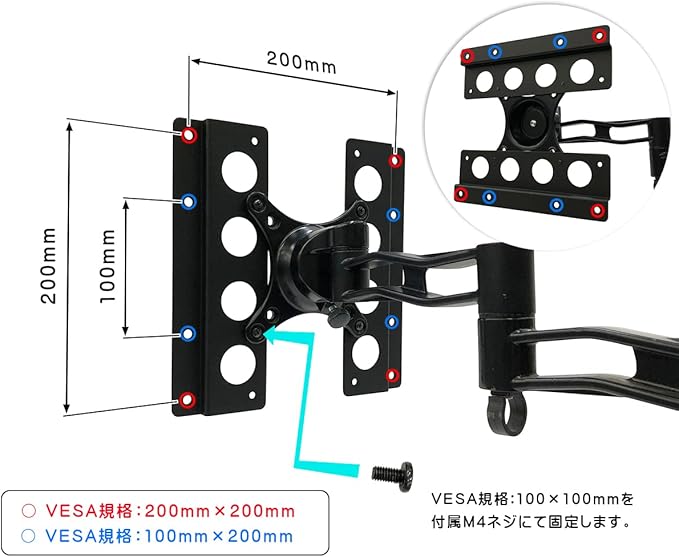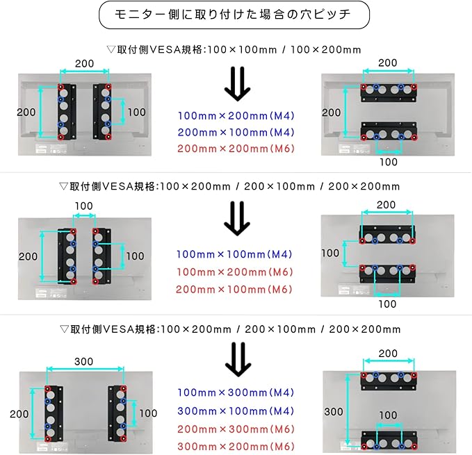 モニター側に設置する場合の変換パターン 取付側VESA規格100 100mm → 100 200mm(M4) / 200 200mm(M6)、200 200mm → 100 100mm(M4) / 100 200mm(M6)、200 300mm → 200 200mm(M6) / 200 400mm(M6)