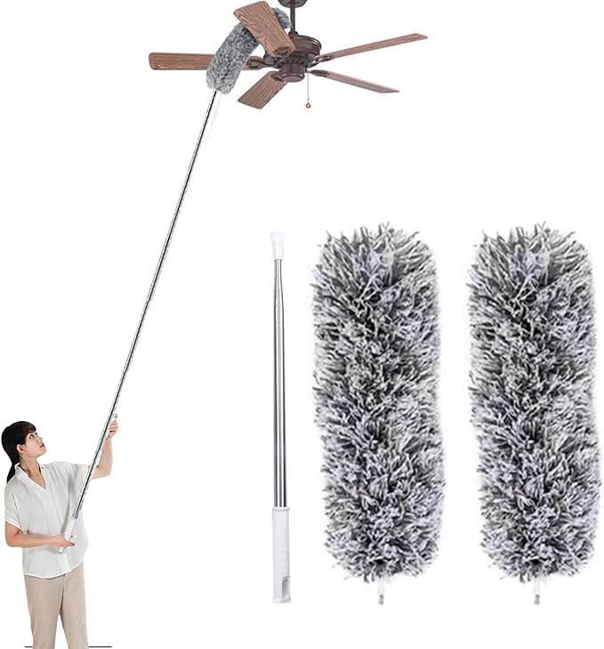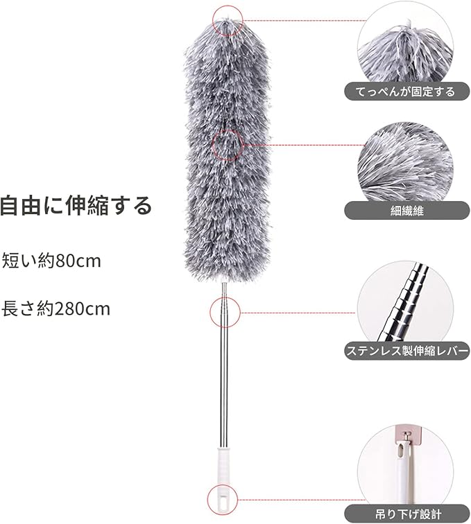 【商品の内容】ステンレスポール本体 1(長さ約40~250cm・重さ:約300g)、ホコリ取りのヘッド 2(マイクロファイバー)。 【いいデザイン】柄の長さは変えられますので、都合の良い長さに調節してお使いいただけます。伸縮可能なはたき、最長280cm、届かない場所にも届きます。 ヘッド部分は360 自由に折り曲げることができます。 【強力集塵・繰り返し使用】やわらかいホコリ&フィルターヘッド(極細繊維素材):強力吸着で汚れが残らない。ホコリ取りはたきは柔らかく、吸水性、耐摩耗性に優れ、床や壁面をやさしく保護し、ホコリ、髪の毛、水などを取り除きます。