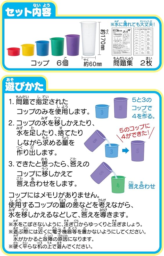 「容量5のコップと容量3のコップだけを使って、水を移しかえて容量4を作る」こんな算数の問題を実際にコップを使って解くことができる商品です。紙面上や頭の中で解くには難しい問題も、実際に手を動かして解くことで意欲的に楽しみながら解き進めることができます。解く過程で『水を移しかえたら、コップの水量はいくつになり、そこからさらに移すといくつになる』といったように思考を積み重ねながら解いていくことによって論理的思考力や数学的思考力を養います。コップは1、2、3、4、5の各コップと6~10が量れるコップがあります。40問の問題が掲載され、濡れても大丈夫な問題集も入っています。