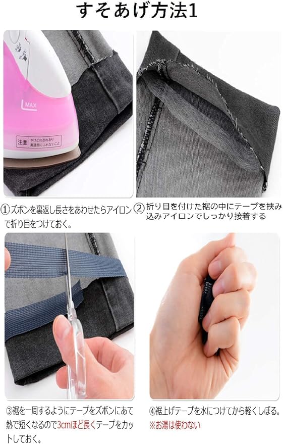 ✅【裾上げテープ単体で使用出来ます】この商品は、裾上げテープとしても使用可能。アイロンを準備し、ズボンを裏返してテープをアイロンで固定する手順を説明している。