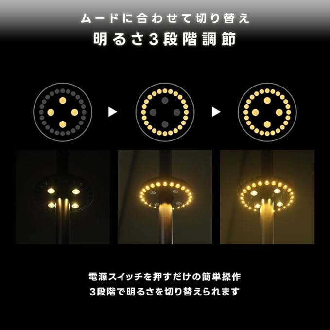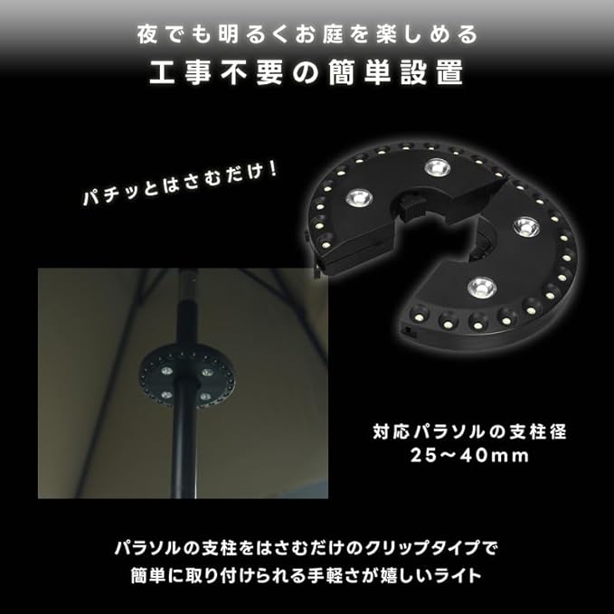 パティオアンブレラライトは、店にある通常のものよりもはるかにポータブルです。直径16センチメートル、高さ2.5センチメートル 1個 ルーメン:6-7 lm ライト数 中間部4個+周り24個=28個 対応パラソルの支柱径:25~40mm