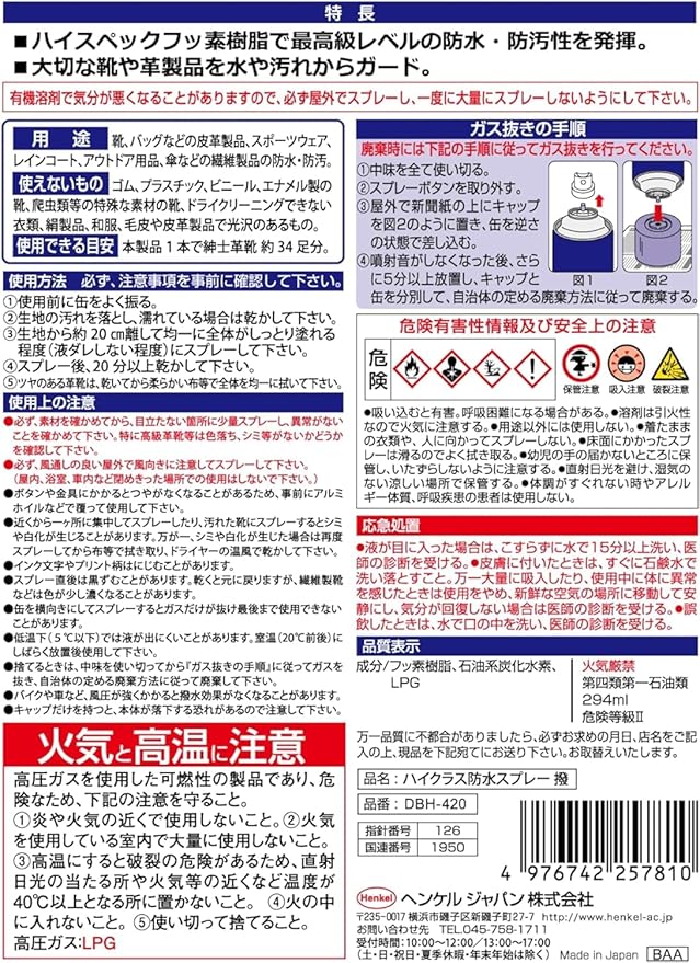 多用途:靴、バッグなどの皮革製品、スポーツウェア、レインコート、アウトドア用品、傘などの繊維製品の防水・防汚に適しています。