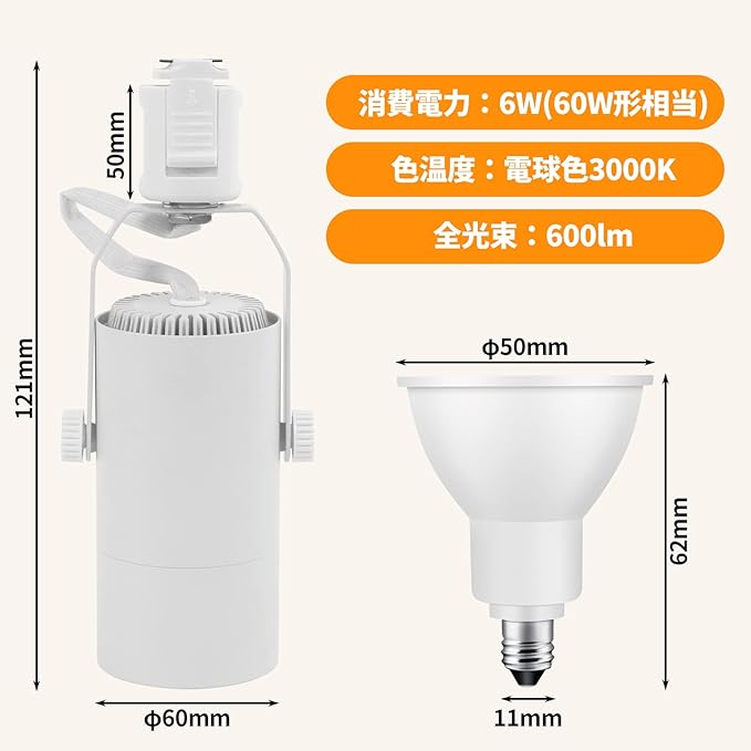 ダクトレール用 スポットライト E11口金 白 ダクトレール LED電球 E11 60W形相当 電球色 6W 600lm ライティングバー用照明器具 LED電球+器具セット ledスポットライト付き 天井照明 人気 (白 + 電球色)