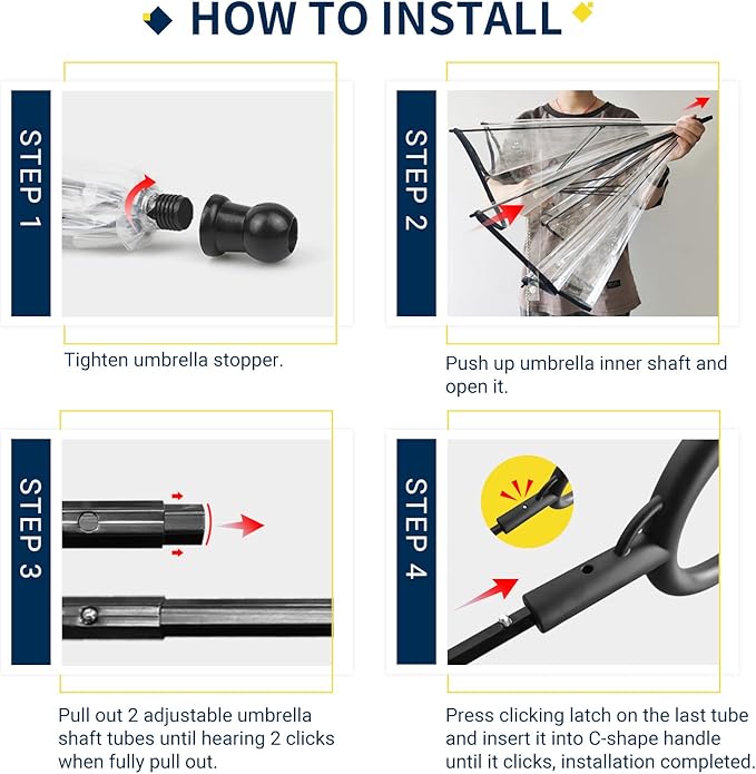 取付簡単:ステップ1.傘キャップを取付る。ステップ2.手あるいはペンチで中棒を引き出す。ステップ3.ステップ 3 - 最後のチューブのクリック ラッチを押し、カチッと音がするまで C 字型ハンドルに挿入します。取り付けが完了します。