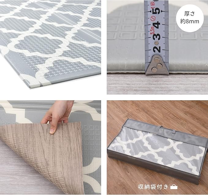 飲み物や液体をうっかりこぼしても表面で水玉状になり汚れがつきにくいのでサッと拭き取るだけ。お手入れが簡単です。適度な弾力ががあり、子供のプレイスペースやおむつ替えスペースにもおすすめです。また、汚れやすいダイニングテーブルの下に敷くのも◎