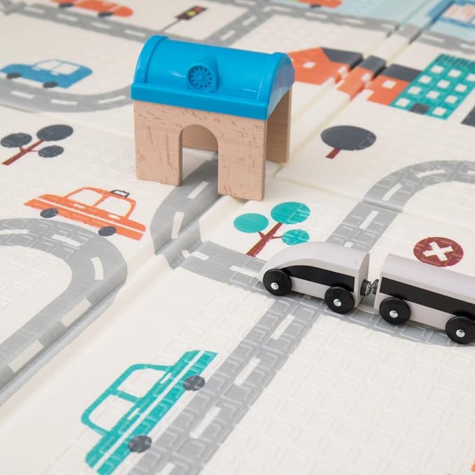 リバーシブル仕様です。表柄は、子供が喜ぶ道路柄です。ミニカーなどのおもちゃで楽しく遊べちゃいます。裏柄はシンプルな木目柄です。お部屋のインテリアや その日の気分にあわせて使い分けできます。
