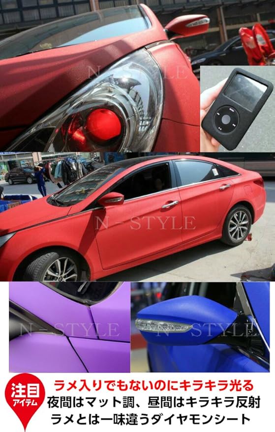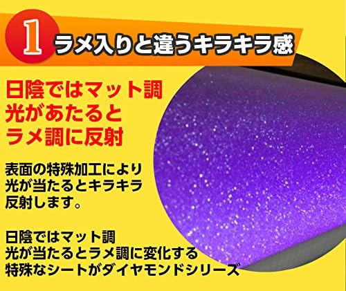 光の反射でキラキラ光り、暗い所ではマット調になる特殊ラッピングシート。耐熱、耐水仕様ですので自動車・バイクなどの内装、外装問わず施工できます! また、ヒートガン、ドライヤーで温めると伸びるので曲面も簡単施工可能 粘着面にはエア抜き用の細かな溝が加工されておりエア噛みしにくく、施工が簡単です。 跡残りが少ない粘着タイプですので時間が経っても剥がすのも簡単です。 少々失敗しても貼りなおしも可能です。