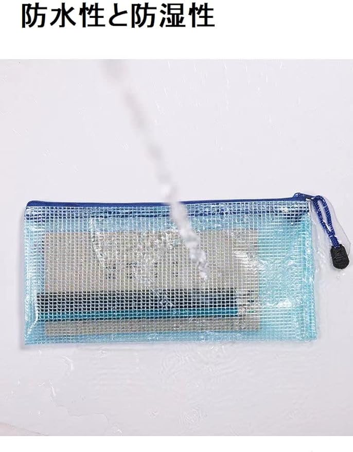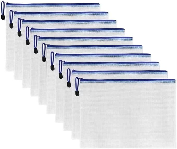 10個入 ジッパー式ファイル袋 ファイルケース メッシュドキュメントバッグ 新聞 雑誌 現金 ジッパー ファイルバッグ 收納袋 クリアホルダー 撥水 網目 ファスナ付 マルチサイズ 紙文書 半透明 PVC製 ファイル メモ コイン 旅行 アクセサリー 化粧品の保管 ファイルホルダー(A6,青+白)