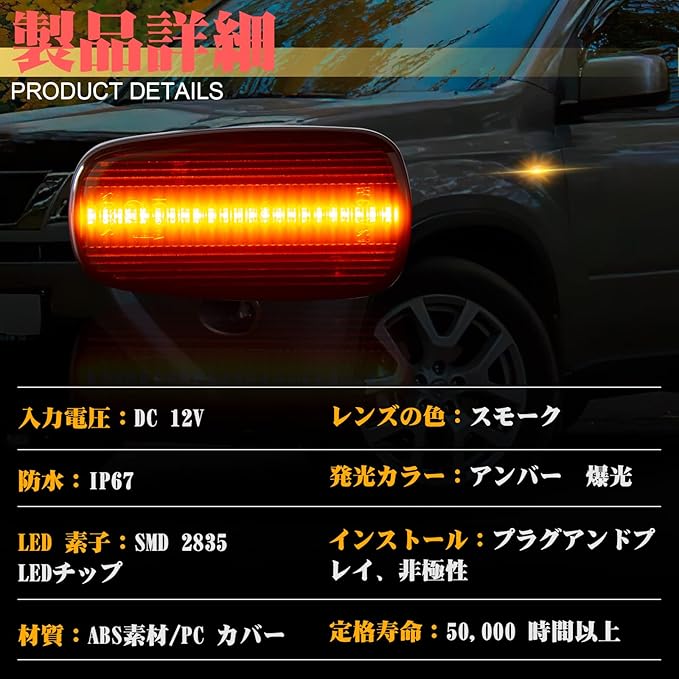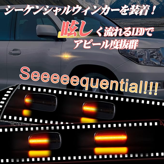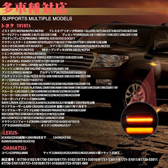 GemPro 30セルシオ プリウス20 サイドマーカーled シーケンシャル ウィッシュ10系 RAV4 アイシス10系 シエンタ80系 プログレ10系 ブレビス10系 アリオン240系 ウィルサイファ70 クラウンエステート170 イスト60 カローラスパシオ120 bB ファンカーゴ20 マーク2ブリット110系 ランドクルーザー200系などトヨタ適用 流れるウインカー 2個(スモーク)