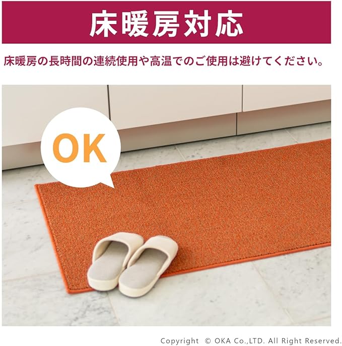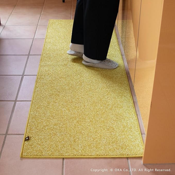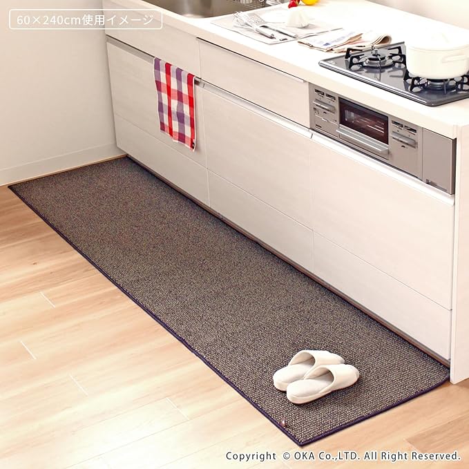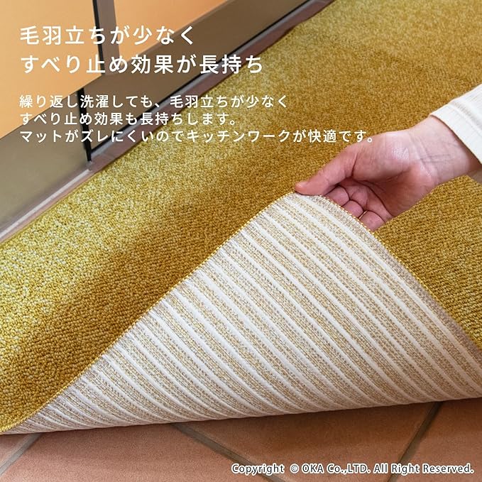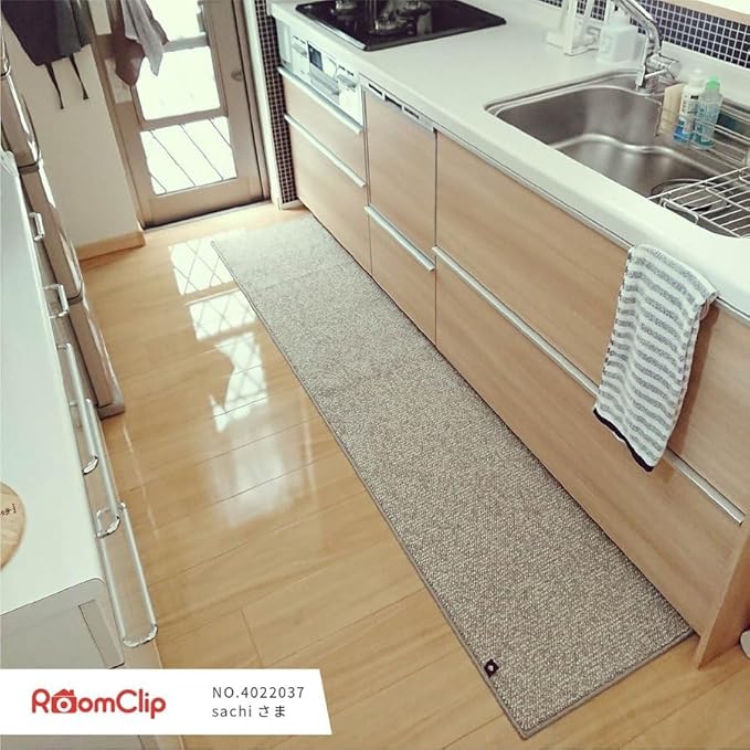フローリングの床に似合うモダンなカラーが魅力のプリスベイス キッチンマット。それぞれ異なる3色の糸をミックスし、単色にはない上質な色合いのマットに仕上げました。木の床に馴染む、飽きのこないナチュラルな雰囲気。乾きが早く、繰り返し洗濯してもへたりにくいのが特長です。キッチンマットの厚みは約6mm。薄手なので扉の開閉や、最下段の引き出しの開閉や下段の収納の引き出しを邪魔しません。繰り返し洗濯をしても、毛羽立ちが少なく、すべり止め効果も長持ちします。マットがずれにくいのでキッチンワークが快適です。カラーも糸密度も上質なつくりの日本製キッチンマットです。