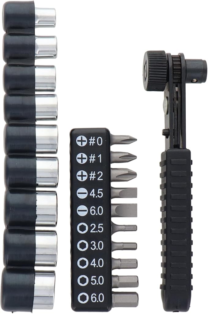 セット内容:ソケット/5、6、7、8、9、10、11、12、13mm、ラチェットハンドル、ドライバービット/+0、+1、+2、-4、-5、-6、六角ビット/2.5、3、4、5、6mm