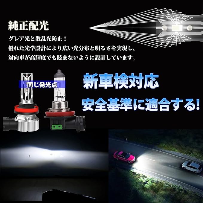 【新車検基準対応・精密配光設計】LED発光点を純正バルブ位置に合わせて精密に設計し、従来の光り方を再現。散乱光やグレア光を抑えつつ、見やすい配光を実現しました。※車検対応は車種のリフレクター形状や地域の検査基準により異なる場合があります。