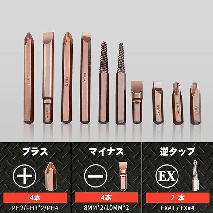【高品質素材】全てのビットはS2合金鋼が採用される。S2合金鋼の硬度は60HRC、クロムバナジウム鋼の硬度は熱処理前45HRC、熱処理後60HRC以上。通常のクロムバナジウム鋼より硬いが、熱処理済みのクロムバナジウム鋼よりは少し硬度が低いが、S2工具鋼は耐久性、衝撃・振動耐性二優れている。