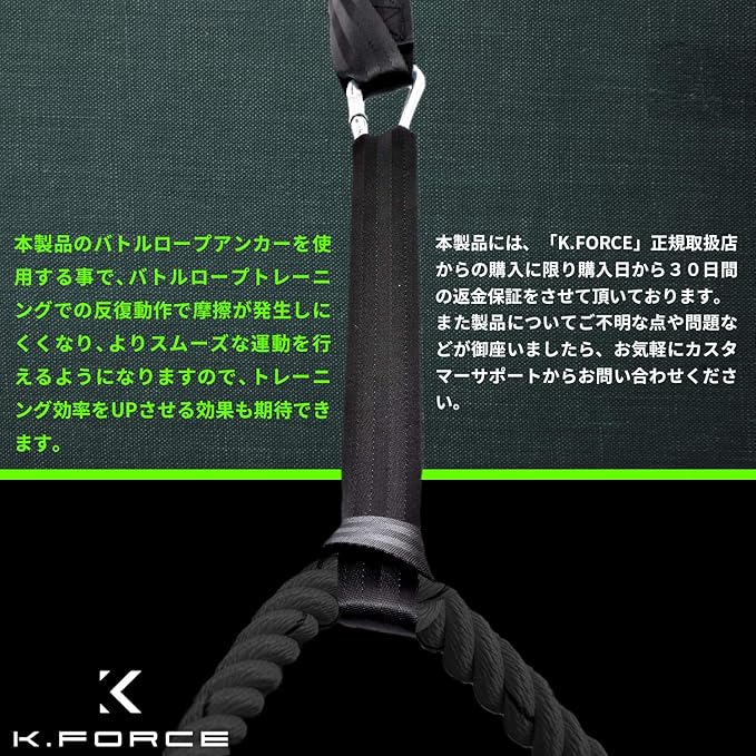 ※本製品のバトルロープアンカーを使用する際は、大型筋トレ器具やポール、柱などの固定された物に取り付けてご使用ください。 ※バトルロープアンカー2本1組(カラビナ付)で固定できるバトルロープは1本です。 ※牽引には使用できません。
