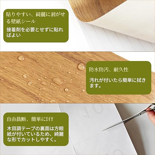 【簡単に貼れる木目調壁紙シール】接着剤不要で裏面に粘りがついており、そのまま貼り付けられる。貼って剥がせる使用なのでちょっとしたリメイクなどにはとても良いです。10cmの幅で、初心者でも綺麗に貼れます、賃貸でも安心にご利用いただけます。