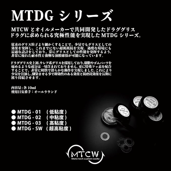 シリーズ名:【MTDG ドラググリス 】……MTCWとオイルメーカーで共同開発したドラググリスに求められる性能を実現したシリーズ!ドラググリスでは珍しい「ウレア系グリス+特殊フッ素配合」を採用し、パーツを痛めず常に軽快で滑らかな動作を実現!これにより従来のグリス粒子より細かく、少量でもグリスの持つ「即効性のある効果」「防磨耗効果」を長期的に発揮し、過酷な環境でも性能を発揮する「非常に優れた耐水性と強靭な油膜」を確保!