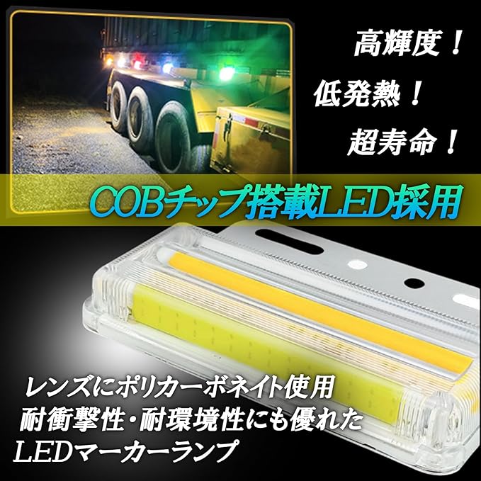 【仕様】マーカーランプ24vトラック用ledはLEDに高輝度COB LEDを採用することにより、夜間、悪天候の環境においても他の車両に注意を促す事が可能です。Iedマーカーランプ24Vの発光部は正面及びサイド、ダウンライトを搭載し広範囲に光を照射し、全方位照射を実現しました。
