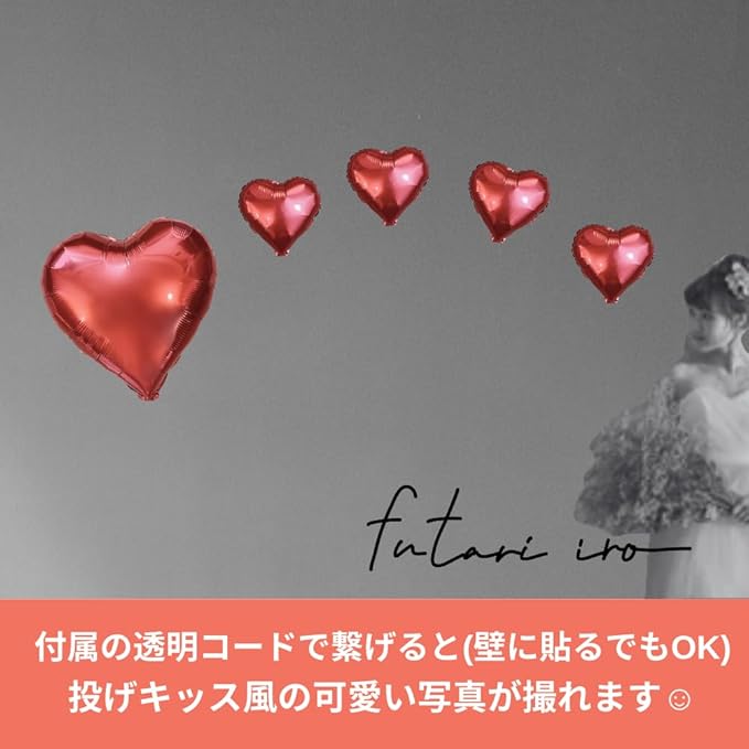 【フォトウェディングや結婚式の装飾に】前撮り、後撮りやウェルカムスペースの装飾などにお使いいだだける、可愛いハートのバルーンです。 【投げキッスショットで写真映え】ハートバルーンを紐などで繋げ(壁に貼るでもOK)、2人で持って写真を撮れば、投げキッスをする新婦さんから、たくさんのハートが新郎さんの手元に♡ とっても可愛い投げキッスショットが撮れます。 【使い方も簡単】ストローで簡単に膨らませることができます。使い終わったら空気を抜くことで何度でも使えます。 【一味違う写真に】可愛くてユーモア溢れる思い出作りにぜひ♡当店の商品をご利用ください。