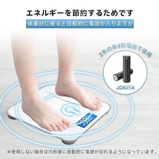 【2本の単4形電池で使用/使いやすい】体重計に乗ると自動的に電源が入りますが、使用しない場合は15秒後に自動的に電源が切れるようになっています。エネルギーを節約するためです。