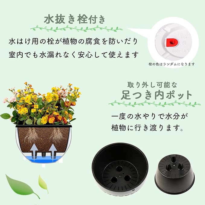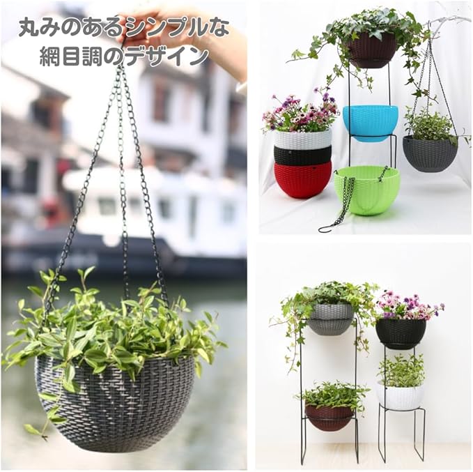 【サイズ、仕様】直径16.5cm、高さ:11cm、取り外し可能な足付き内ポット、フック付きの長さの最大45cmまで調整出来るチェーン、本体は丈夫な樹脂。内ポットはプラスチック。底穴栓の色はランダムとなります。付属のチェーンは取り外しが出来、吊り下げ、床置きを選べます。