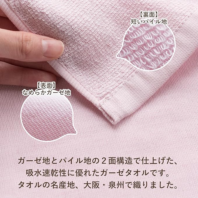 【優れた速乾・吸水性】表面は速乾性のあるガーゼ地、裏面は吸水性のあるパイル生地を使用しています。