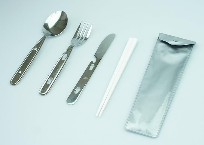 トレッキングやピクニック、キャンプなどのシーンに合わせて活躍するナイフ・フォーク・スプーン・箸の4点セット。