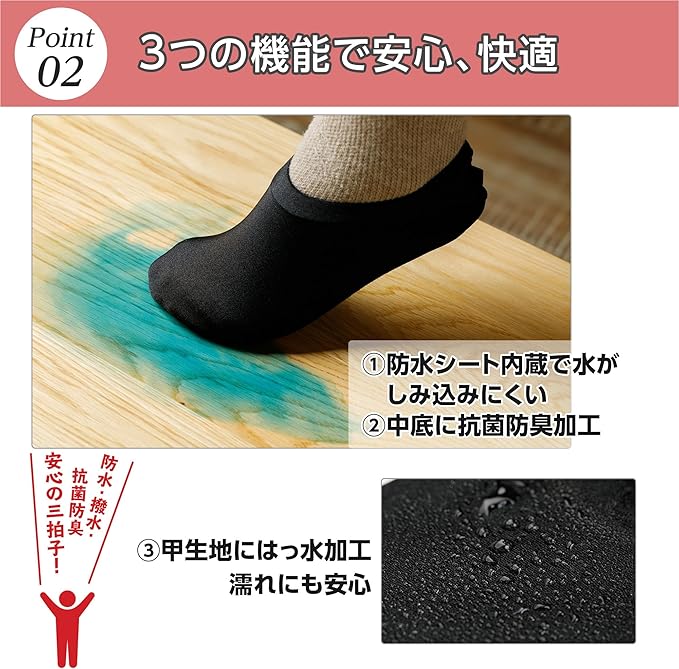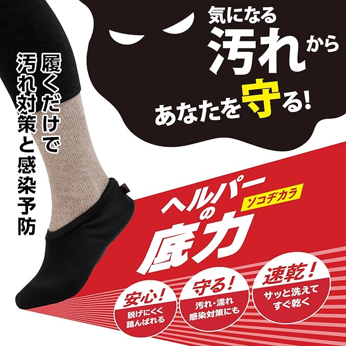 薄手でのびのび!サッと履けて脱げにくい 甲生地は撥水加工で濡れにも安心!、除菌スプレーでのお手入れ可能、滑りにくい靴底、さと洗えてすぐ乾く。