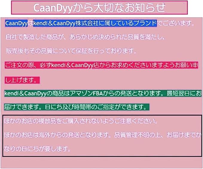 ※ CaanDyyはkendi&CaanDyy株式会社のブランドでございます。他のお店にてご購入された場合、当店は品質保証できかねますので、ご注文際、必ずFBAから出荷のkendi&CaanDyyからご注文をお願い申し上げます。