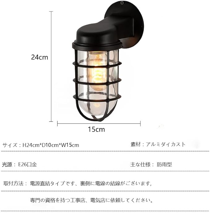 サイズ 約 奥行150 / 高240 mm、壁面直付け 、素材: 本体:鉄。光源の種類:口金E26 110V (電球は別売り) 白熱電球対応 電球型蛍光灯対応 LED電球対応。