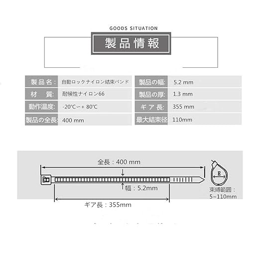 サイズ:全長400mm、幅5.2mm、厚さ1.3mm、最大結束直径110mm。