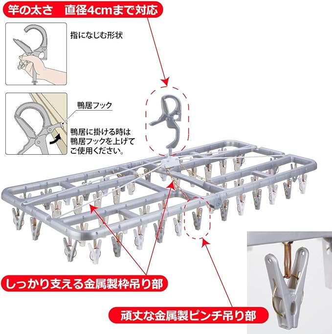 洗濯物が早く乾くようにピンチレイアウトを考えた、フレームが94cmもある超大型角ハンガー。