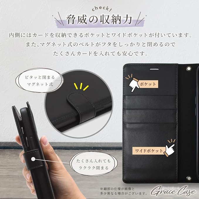 【便利な機能】 蓋はマグネット留め仕様でしっかり留まります。3つのカードポケットがあるので、カードなどを収納することが出来ます。また、スタンド機能もある為、動画視聴も快適です。