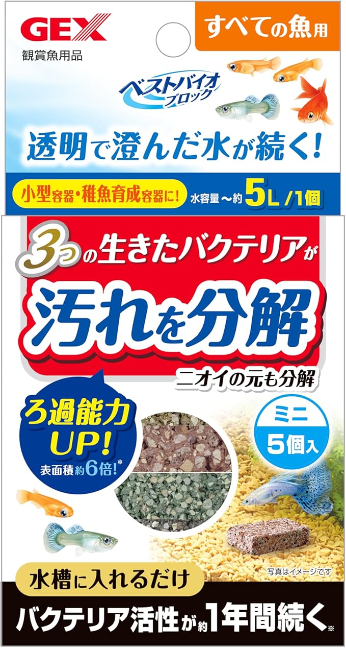 白濁りや水質への影響を無くすため、本製品を別容器に入れて、約12時間を目安に水に浸してからご使用ください。 使用量の目安を参考に、メダカケースに沈めてご使用ください。使用量が多いほど分解効果は高くなりますが、多く使用する場合は、水質の変化に留意しながらご使用ください。 フィルターまたはエアレーションを使用した水槽でお使いいただくと、より効果的です。 本製品はコケの発生を抑制する効果はありません。本製品にコケ等が付着した場合は飼育水もしくは塩素を中和した水で洗ってご使用ください。 ※ブロック内部のバクテリアは長期的に増殖しますが、飼育環境によっては多孔質構造内部が目詰まりし、効果が弱まる場合があります。水に入れた状態で約1年を目安に交換することをおすすめします。