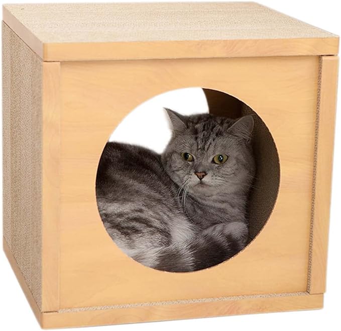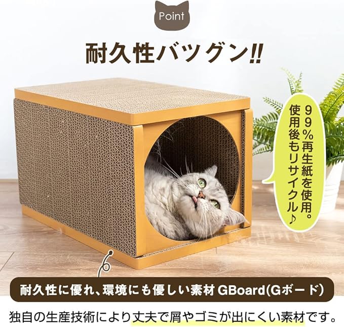 耐久性に優れ、GBoardと呼ぶフラットで強力な紙パネルで作られている、つめとぎ付きキャットハウス。 壁面には爪とぎがあり、愛猫ちゃんが喜びます。 猫ちゃんは狭い所が大好き(=^・・^=) 猫ちゃんのくつろぎのお部屋になります。 リサイクル紙で作られており環境にやさしく、処分も簡単で費用が掛かりません。 見た目もシンプルで、どんなインテリアにもマッチします。