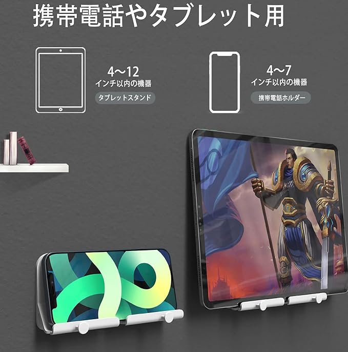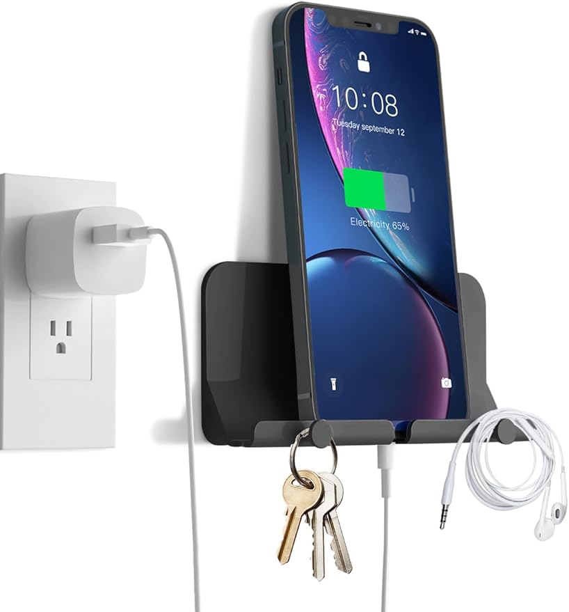 【充電しながら使用可能】この携帯壁掛けホルダーは下の部分に穴が設計されました。イヤホンやUSBケーブルを差し込むことができます。コンセントがあるところに置いて充電しながら、いつもビデオを見ながら安心に楽しんでいただけます。電源が切れるのことを悩めません。壁掛け式ですので、コンパクトで場所を取らずどこにも有効的に活用することができます。