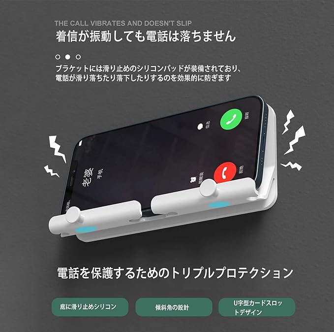 【滑り防止設計&防水耐耐久性抜群】スマホ壁掛けホルダーの底部は滑り止めゴム素材を採用しております。不注意による転倒や損傷防止をしかっり防げます。滑り止めにより携帯電話が落下する心配がなくなります。耐水性と耐久性があるので浴室、洗面台、玄関などはもちろん、キッチン等油付きやすい場所にも手を解放して料理しながら快適に利用できます。