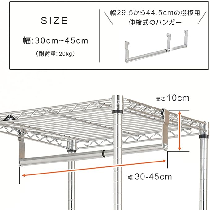 ドウシシャ ルミナスラック 伸縮式ハンガーポール 幅30~45cm棚専用 19HP-30S 耐荷重20kg ポール径19mm スチールラックパーツ 大容量 取付簡単 棚板に引っ掛けるだけ diy ハンガーラック ワードローブ 追加部品 防錆加工
