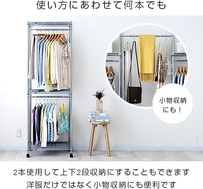 シェルフに取り付けることでラックをワードローブとしてご使用できます。伸縮タイプなので幅30~45cmの棚に適応できます。ルミナスポール径19mm専用パーツになります。