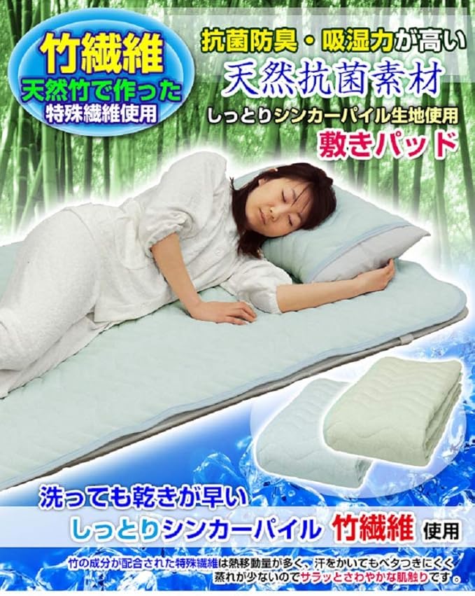 天然素材の竹を風合い柔らかなシンカーパイルに仕上げた肌触りの良い「敷きパッド」です。 竹繊維は抗菌性が高く雑菌繁殖を抑制する効果があるので、抗菌防臭効果が期待できます。 (財)ボーケン基準 抗菌性試験にて基準綿布と竹繊維生地を比較し殺菌活性値、静菌活性値を実証。