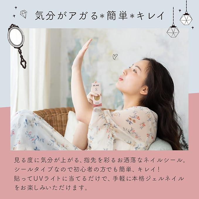 【初心者でも簡単】 シールの中から自分の爪に合ったサイズを探して貼り付けるだけ!UVライトを当てるのも60秒だからあっという間! やわらかいシールタイプ浮くことなくピッタリ密着。初心者でも簡単にジェルネイルが楽しめます♪ 接着面がシールの為、剥がす時も爪を傷めることなく綺麗に剥がすことが出来ます。