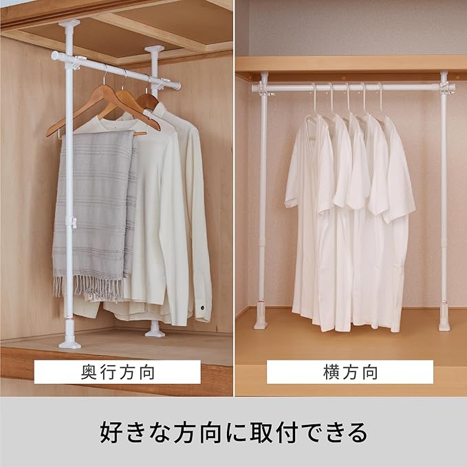 高さ・幅を調整できるので、クローゼットや押入れなど置きたい場所のサイズに合わせて衣類を掛けるハンガーを設置できる。