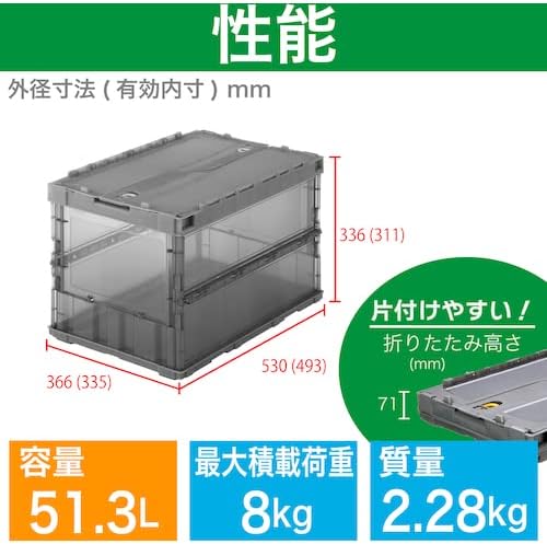 ●スライドロックフタ付●最大積載荷重:8kg●商品や部品・備品の配送および保管・管理。●内容物の種類・大きさが一定でない荷物の配送に最適。●中が透けて見えるため、コンテナの中身が判別しやすく、保管・管理に最適です。●折りたたんだ時の高さを最大限まで追求、従来タイプに比べて最大35%低く、これにより輸送運賃・保管スペースを大幅に削減することができます。●組み立て時も、折りたたみ時にも積み重ねができ荷崩れの心配がありません。