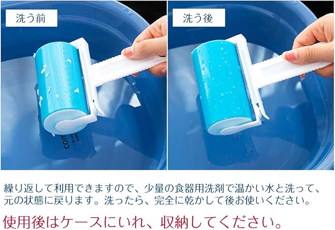 繰り返し使用可能、何度もお使いいただいても吸着力は変わらずに埃やごみが取れます。もし粘着力がなくなってきたら、水(ぬるま湯)で洗いし、少し振って水気をきちんと干すだけで粘着力が復活します。