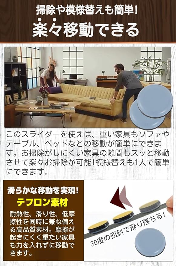 【楽々移動できる】このスライダーを使えば、重い家具もソファやテーブル、ベッドなどの移動が簡単にできます。お掃除がしにくい家具の隙間もスッと移動させて楽々お掃除が可能!模様替えも1人で簡単にできます。