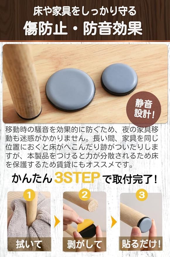 【傷防止・防音効果】移動時の騒音を効果的に防ぐため、夜の家具移動も迷惑がかかりません。長い間、家具を同じ位置におくと床がへこんだり跡がついたりしますが、本製品をつけると力が分散されるため床を保護するため賃貸にもオススメです。
