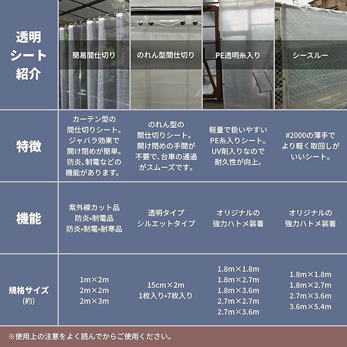 PE製の透明シートです。明るさや見通しを確保しつつ、間仕切りやカバーとしての使用に適しています。