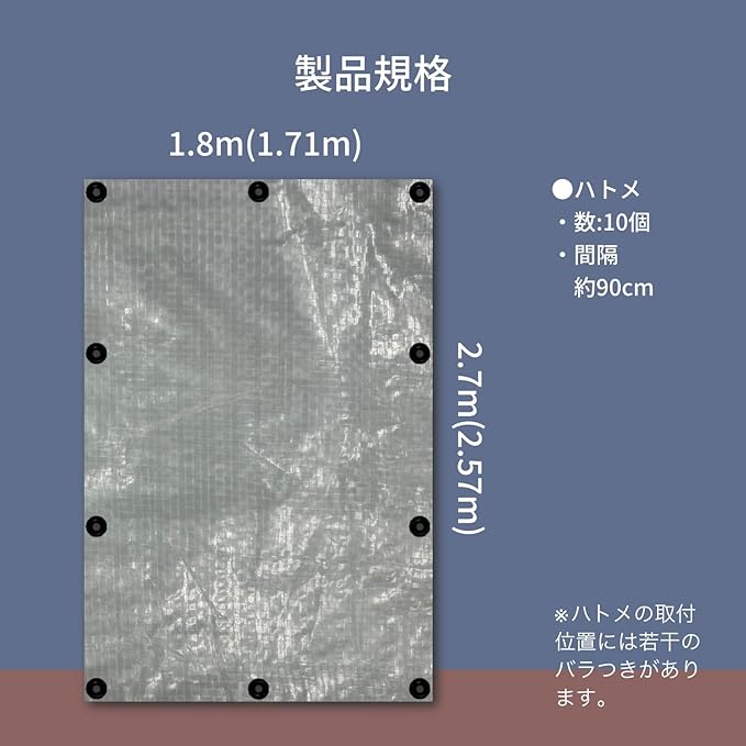 シート厚み:0.15 0.02㎜ シートサイズ:1.8m 2.7m(仕上:1.71m 2.57m) ハトメ内径:約12㎜ ハトメ間隔:約90cm ハトメ個数:10個