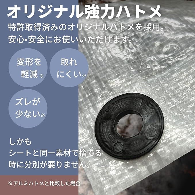 当社オリジナルのプラハトメを採用。一般的なアルミハトメよりも変形・ズレ・脱落に強い仕様のハトメとなっています。シートと同一素材のため廃棄時に分別も必要ありません。