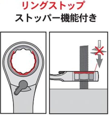 フラットな左右回転切替スイッチは、ワンフィンガーで簡単に操作できます。またメガネ部はストッパー付き(リングストップ)のためナットを確実にホールドし、作業性が大幅にアップします。